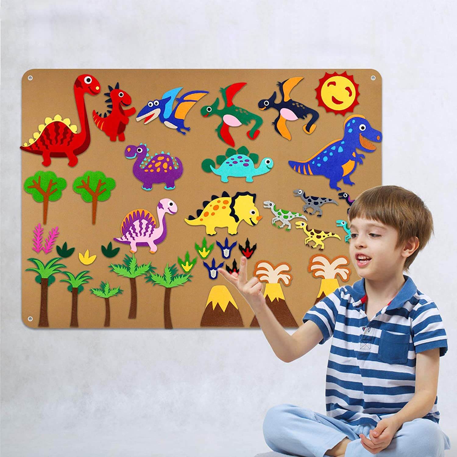 Táto obrovská sada plstených hračiek pre domáce zvieratá s veľkosťou 3,5 stopy obsahuje 33 kusov plsti, ktoré sú veľkostne prispôsobené malým rúčkam. Interaktívne plstené kúsky je možné opakovane presúvať po plstenej doske a veľké plstené pozadie je možné ľahko zavesiť pomocou dvoch pevných háčikov, ktoré sú súčasťou balenia.