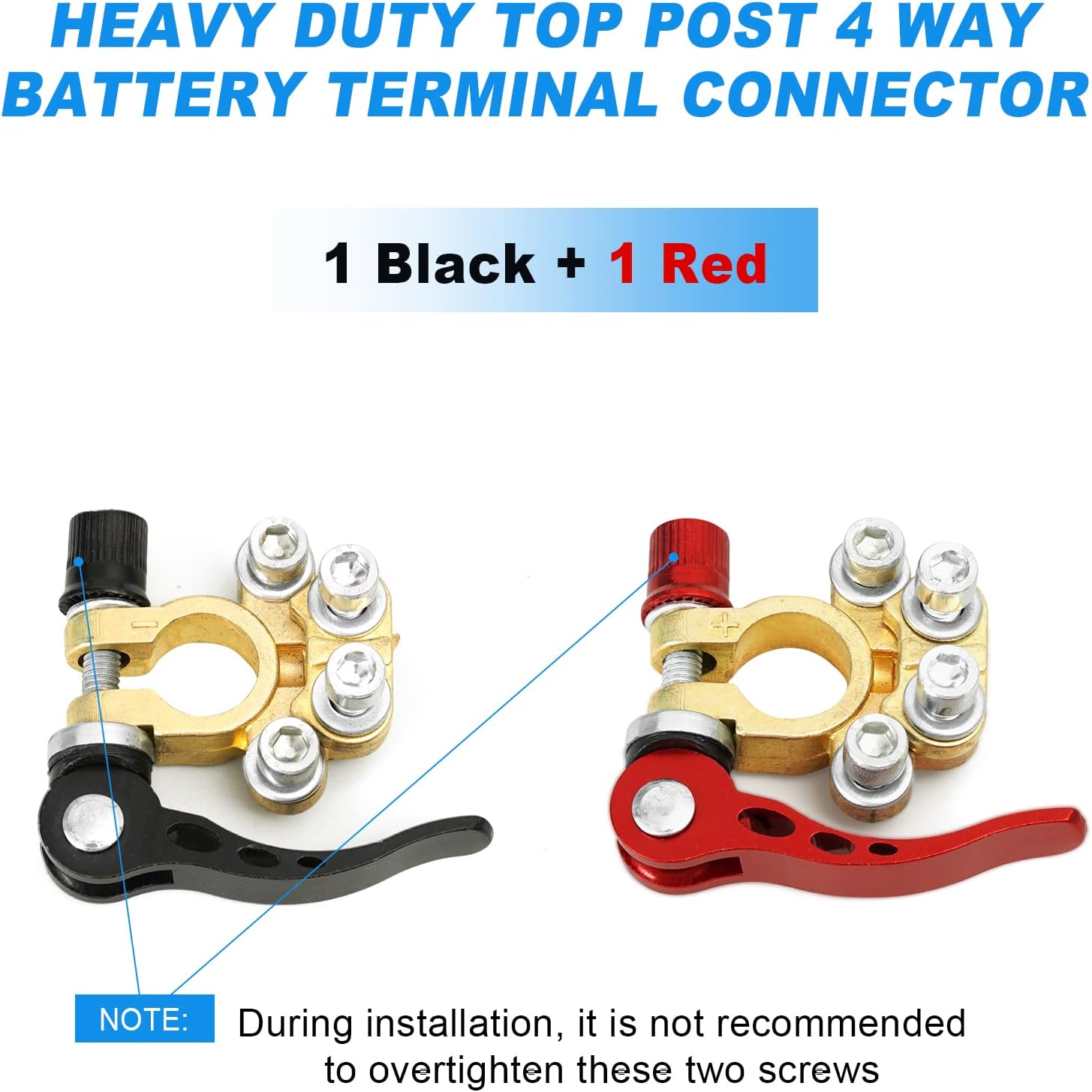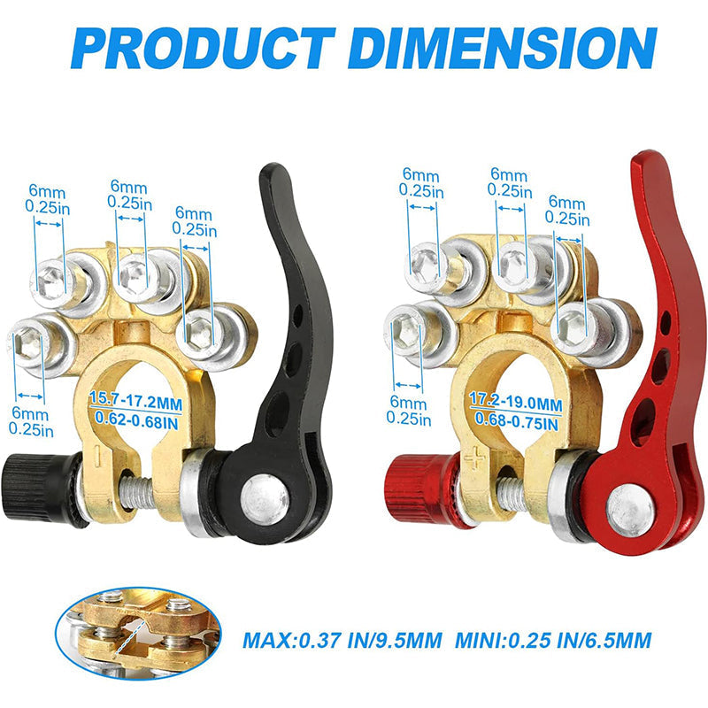 [PLATUS TAIKYMAS] Mūsų akumuliatorių gnybtų jungtys suderinamos su automobiliais, mikroautobusais, nameliais ant ratų, tachografais, sunkvežimiais, pikapais, autobusais ir kt. Jos tinka automobilių akumuliatoriams su SAE/JIS A tipo apvaliais gnybtais. Įsitikinkite, kad teisingas gnybtas prijungtas teisingu poliškumu.