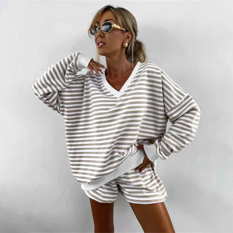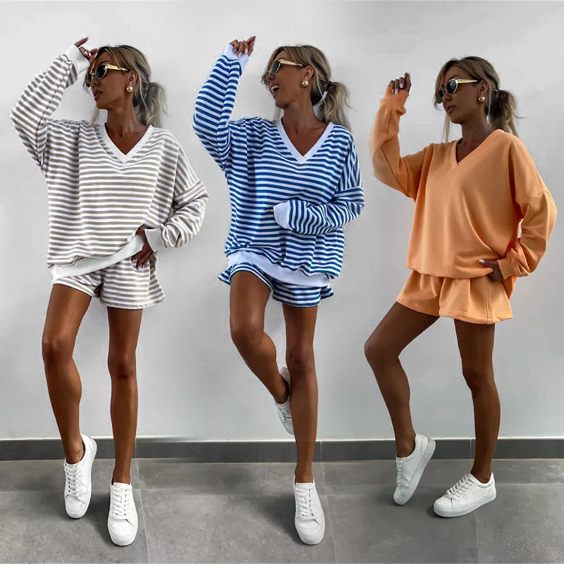 Dviejų dalių moteriška apranga Dryžuota V formos iškirpte Laisvi viršutinė dalis ir šortai