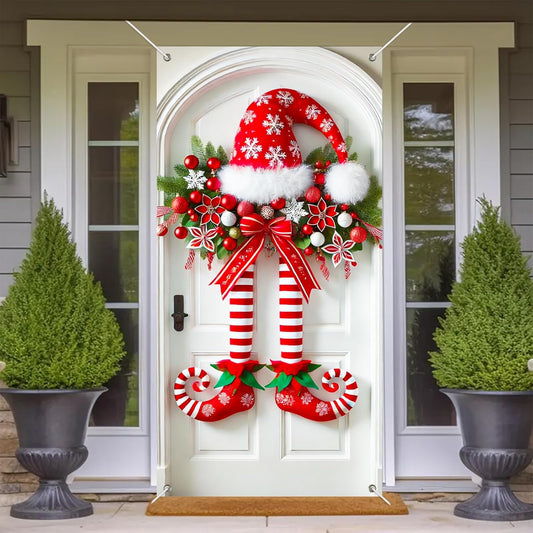 Pancarta navideña con piernas de elfo en la puerta.-ES